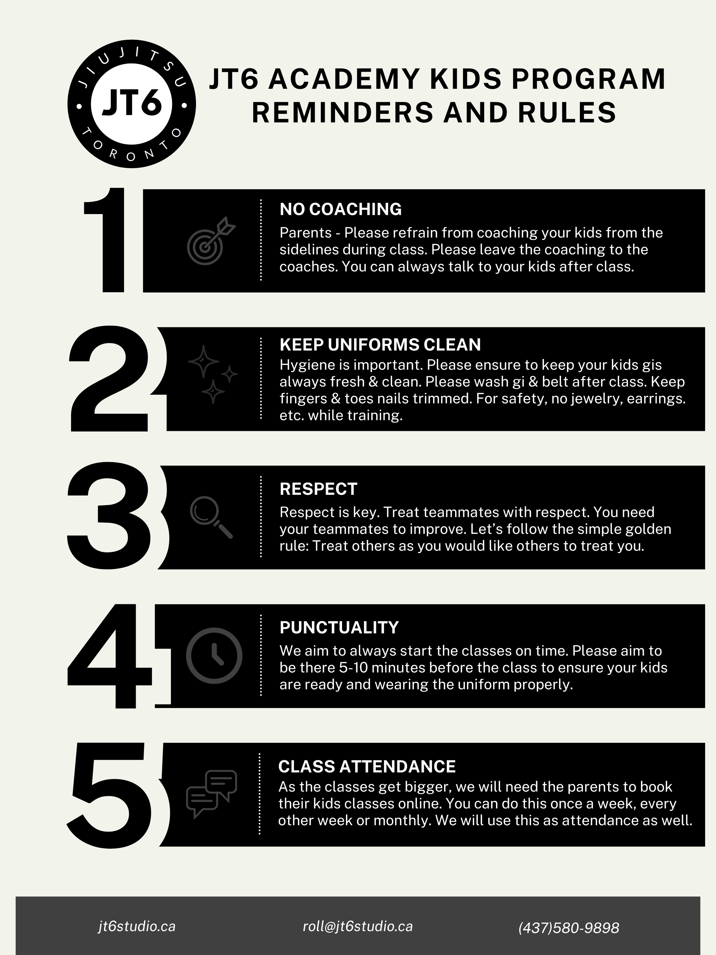 Note: All kids/teen classes are gi classes unless mentioned otherwise. For first timers, please bring any sports clothes and a water bottle. Kids gi and belt (uniforms) are also available for purchase at the Roll Chasers shop below JT6 inside the same building.